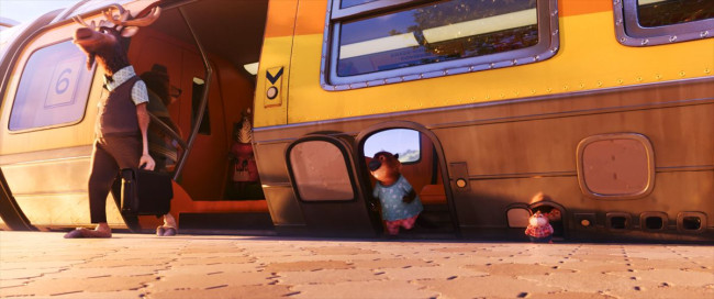 田舎町から警察官になるためにズートピアへと“上京”したジュディが目にするのは、まさに多様性に配慮が行き届いた街並み。電車には大・中・小のドアが用意され、ゾウからネズミまでがそれぞれのサイズに合ったドアを快適に利用できる。水生動物なら水を浴びながら通勤が可能だし、ドリンク店より背の高いキリンに飲み物を渡すのも自動化されていて、小さな体の店員でも働ける。まさに、どんな動物も受け入れる街。ズートピアという街は、多民族国家であり、かつさまざまなジェンダーや見た目、考え方の人を受け入れるアメリカを映すよう。大型動物から小型動物、草食動物から肉食動物までさまざまな種族が一緒に暮らすズートピアに重なる。