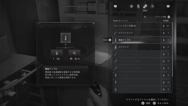 グレースはウイルス感染者の血を利用してアイテムのクラフトができる。「破血アンプル」はゾンビを背後から一撃で倒せる強力なアイテムなので1本あると安心 (C)CAPCOM