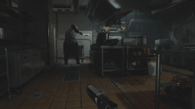 ゾンビの行動にはある程度の規則性がある。このゾンビは料理長なのでキッチンにある物が利用できるかも? (C)CAPCOM