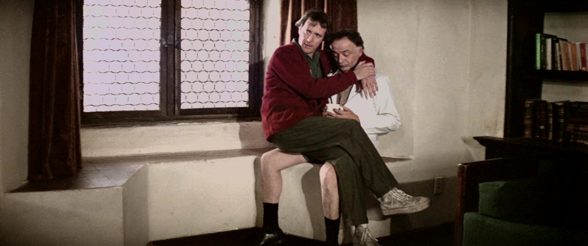患者にズボンを盗まれ、パンツ姿で出迎えたフェル軍医(エド・フランダース)が案内する施設内は風変わりな患者たちばかり。なかでも月ロケット打ち上げ寸前に発狂した宇宙飛行士のカットショウ(スコット・ウィルソン)は反抗的で、肌身離さぬお守りの聖クリストフォロスのメダルをケーンに託し、「神が存在するなら世界にはなぜ悪や苦しみがあるのか」と問う。