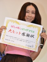 柴咲コウ、顔より大きなグラスで乾杯! 肩だしドレス姿でキメポーズも