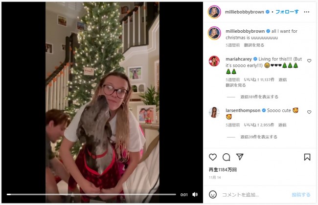 『ストレンジャー・シングス』でおなじみのミリー・ボビー・ブラウンは、マライア・キャリーの名曲「恋人たちのクリスマス」に乗せて、恋人のジェイク・ボン・ジョヴィと一緒にパジャマ姿でツリーの飾りつけをする動画を公開。キャプションには「オール・アイ・ウォント・フォー・クリスマス・イズ・ユウウウウウウウウウウウ」と熱量高めのコメントが。