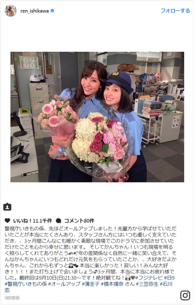 女優の石川恋が、7日に自身のインスタグラムを更新し、放送中のドラマ『警視庁いきもの係』(フジテレビ系/毎週日曜21時)のオールアップを報告するとともに、共演している橋本環奈との2ショット写真を公開。「大好きだよかんちゃん」と橋本への想いを綴っている。