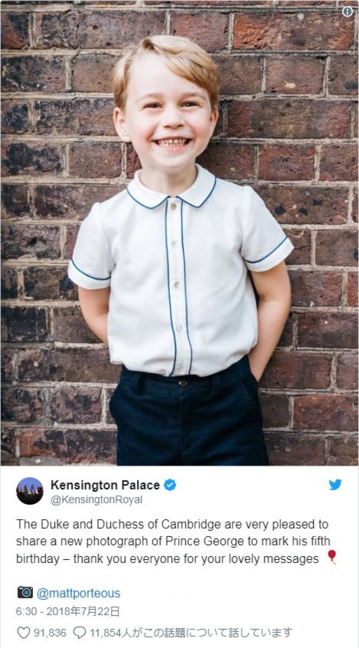 ブルー系のシャツや半ズボン、ハイソックスの衣類を身に着けることが多い現在5歳のジョージ王子。Independentによると、ジョージ王子は児童文学『くまのプーさん』シリーズに登場する少年のキャラクター、“クリスタファー・ロビン風”のスタイルが評価されたとのことだ。