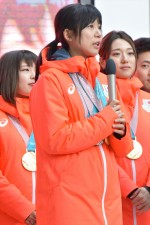 平昌オリンピックのカーリング女子団体戦のメンバー5人(ロコ・ソラーレ北見)が27日、都内で開催された日本代表選手団の帰国報告会に登場。司令塔のスキップ・…