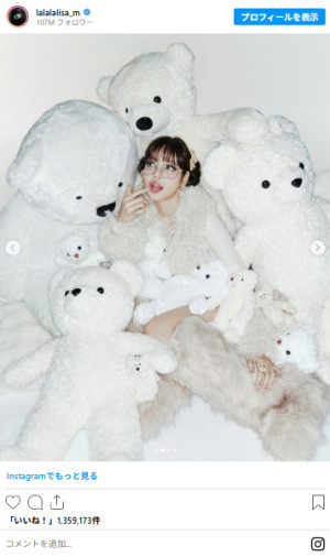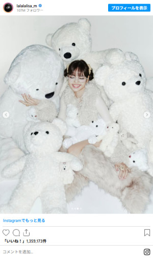 BLACKPINKのLISA(リサ)が、3月27日(金)に自身のInstagramを更新。真っ白いテディベアに囲まれたソロカットを複数枚投稿し、ファンから反響が集まっている。