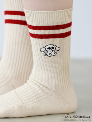 「アイシナモロール 2本ライン刺繍クルー」クロライン×サングラス/クロライン×ヘッドフォン/アカライン×サングラス/コンライン×ヘッドフォン(各1980円) ※価格は税込み (C)2026SANRIO CO., LTD. Sanrio/TBS