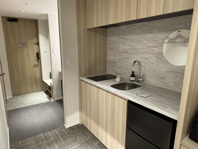 今回宿泊したのは、キングベッドが2つ並ぶ「プレミアムツイン」。客室内にキッチン、洗濯機、バスルームが設置してあり、泊まったその日から暮らすことができてしまいそう。中でも驚いたのが、キッチンの設備の充実度。IHクッキングヒーター、ケトル、電子レンジ、お皿、鍋、包丁…調理に必要な道具がたっぷりそろっていました。本ホテルは施設内にレストランがないため、夜ご飯は自分で用意しなければなりません。ただこれだけ道具がそろっていれば、近くのスーパーで地元ならではの食材を手に入れてスペシャルなディナーを作ることができるでしょう。