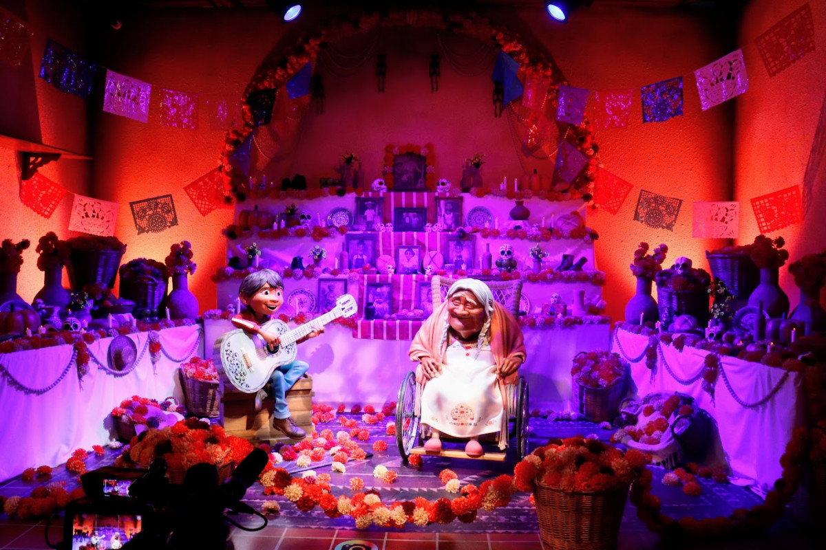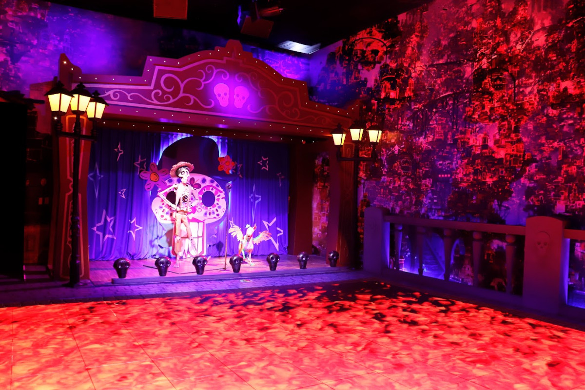 ミゲルやヘクターたちが待つ『リメンバー・ミー』のお部屋。ここでは、オフレンダと呼ばれる祭壇からマリーゴールドの橋を渡り、色鮮やかな死者の国までを巡るストーリーに入り込むことができた。