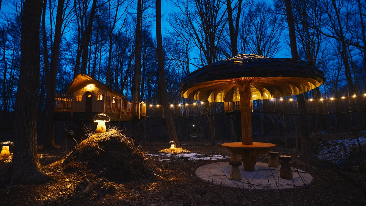 ツリーハウスときのこ型のテーブル